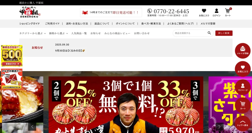 「越前かに職人甲羅組」は、特に楽天市場で絶大な人気を誇る通販サイトです。「楽天ショップ・オブ・ザ・イヤー」を受賞した実績もあり、Eコマースでの販売戦略に長けています 。